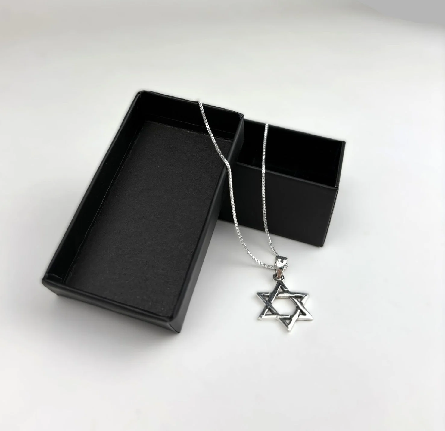 Este collar de plata 925 presenta un colgante con la Estrella de David formada por dos triángulos entrelazados, un símbolo antiguo que representa equilibrio, espiritualidad y conexión con la Tierra Santa.